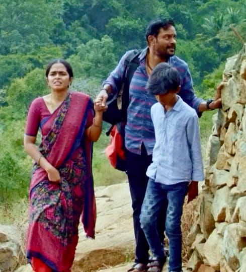 நாயகனாக நடித்திருக்கும் ஹரிஷ் ஓரி, மனைவியாக நடித்திருக்கும் அபிராமி போஸ் உடனும் மகனுடனும் தங்கள் மூதாதையர் வாழ்ந்த மலை கிராமத்தை நோக்கி கடுமையான பாதையில் நடந்து போகிறார்கள்.